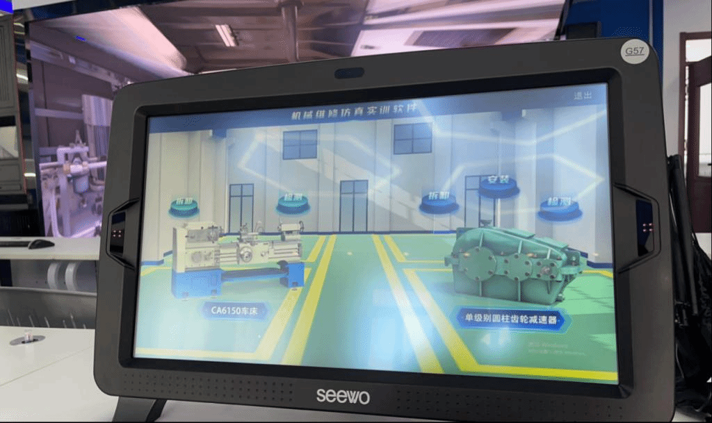 沉浸式VR虚拟仿真实训室于2023年建成,配备了先进的虚拟仿真硬件设备及软件系统,能多方面开展CA6150机床拆装、减速器拆装等相关专业技能的虚拟实训教学。在实训教学中,学生们可以实现在现场边走边学,进行设备拆装操作沉浸式过程体验,大大提升教学效果。